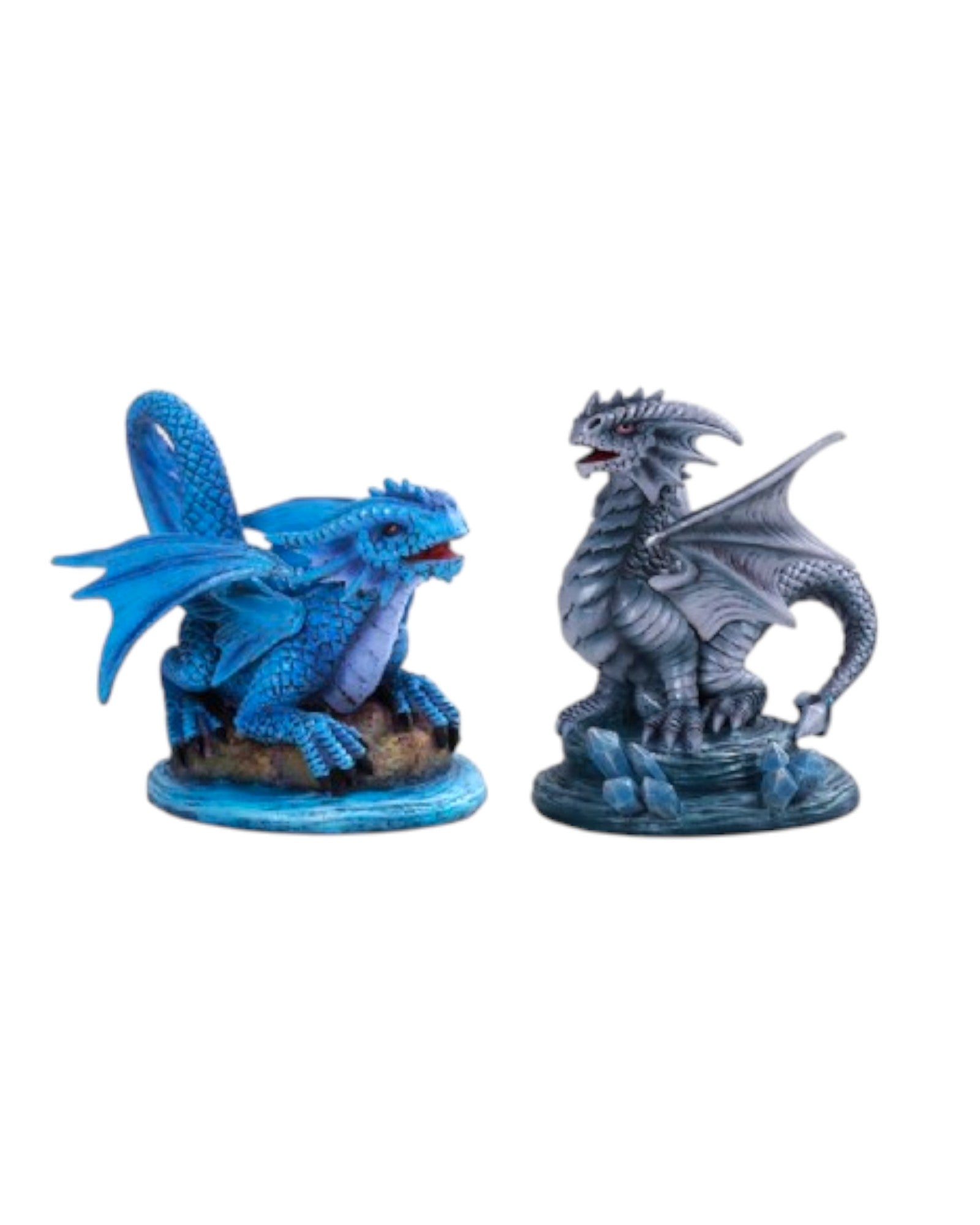Rock Dragon measures 20cm high, 18.2cm wide, and 16.8cm deep, while the Water Dragon is 9cm high, 11.5cm wide, and 9cm deep. Both hand-painted and crafted from polyresin, these charming statues showcase the captivating art of Anne Stokes.