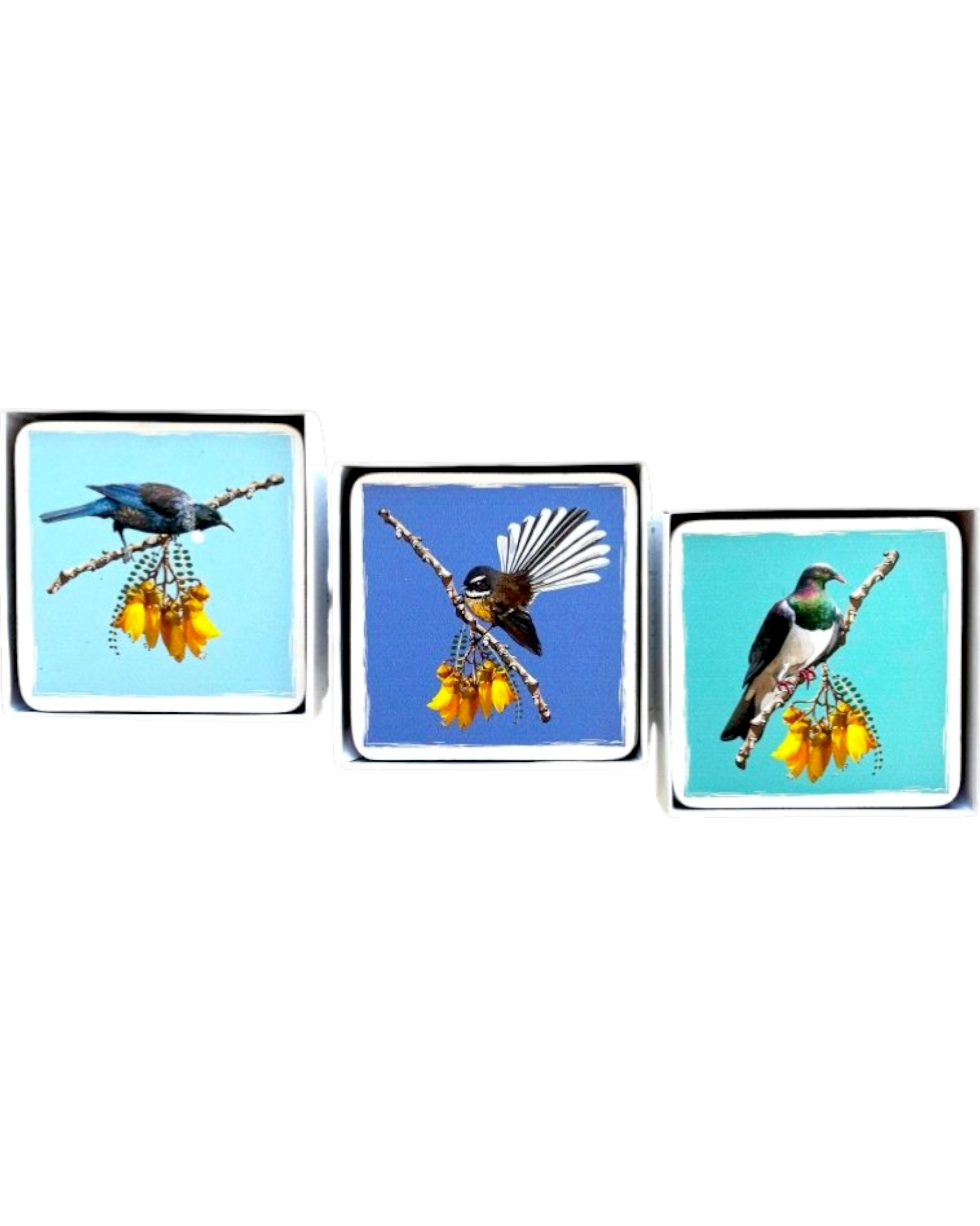 Designs include; Tui/Kowhai, Fantail/Kowhai, Pigeon/Kowhai