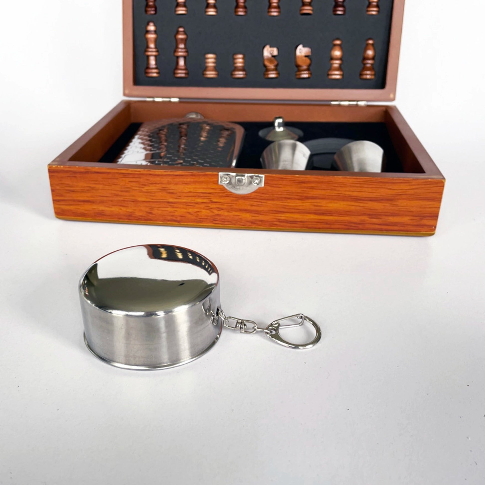 Experience the ultimate combination of luxury and convenience with our 9oz Hip Metal Flask and Wooden Chess Set, complete with four shot cups and a beautifully crafted wooden gift box. Upgrade your game nights and outdoor adventures with this must-have set.
