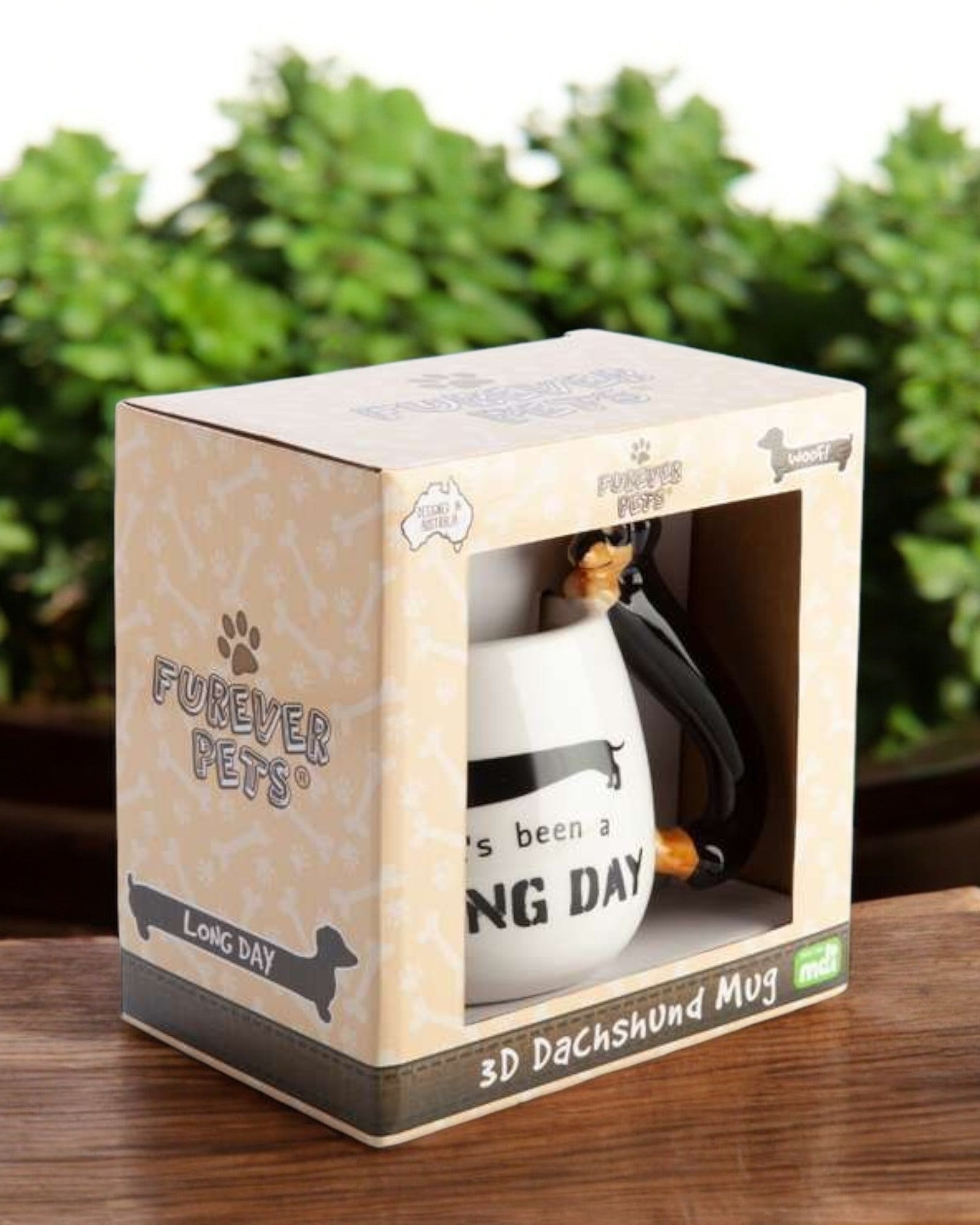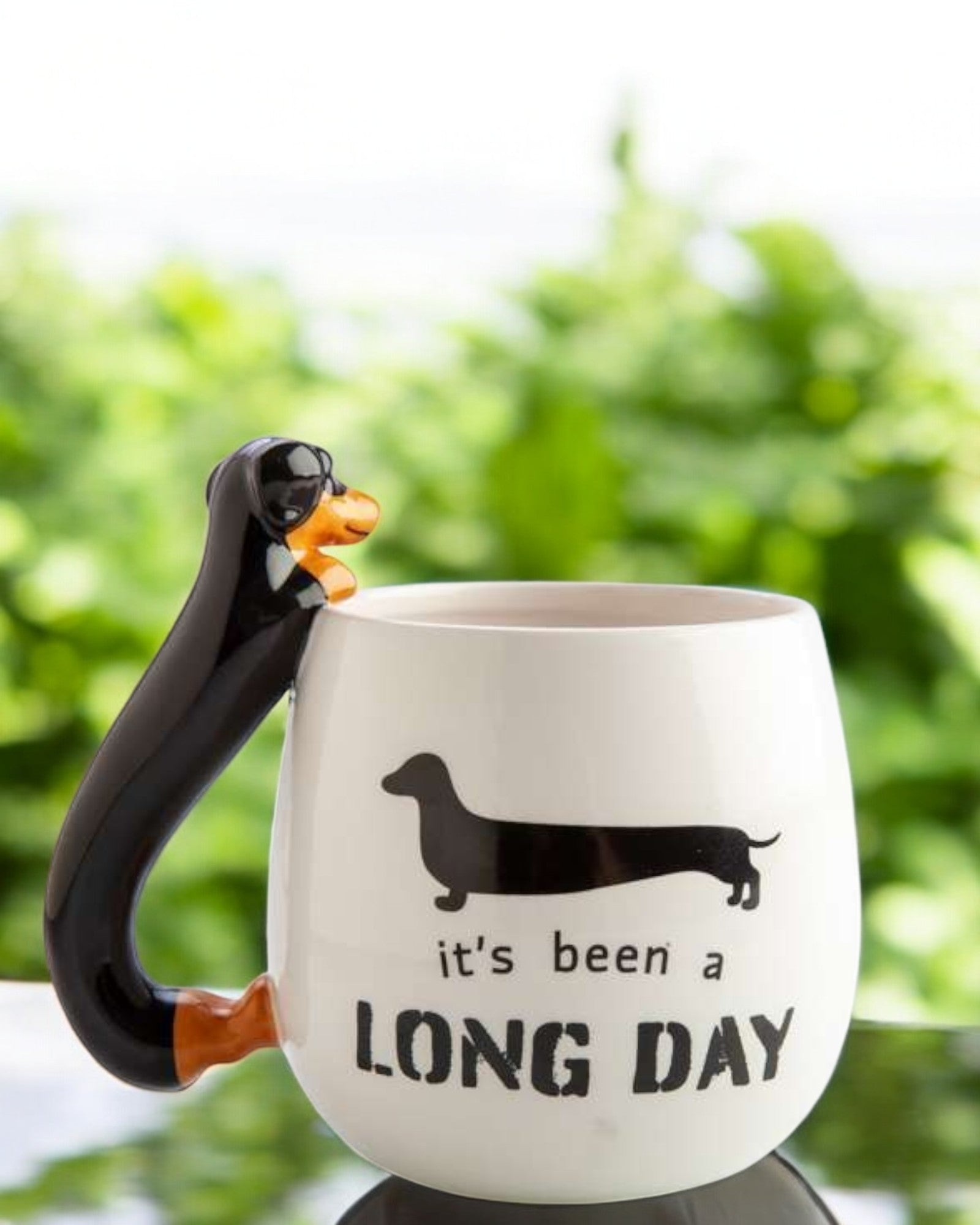 - Dachshund silhouette and punny quote “it’s been a long day” on both sides of the mug