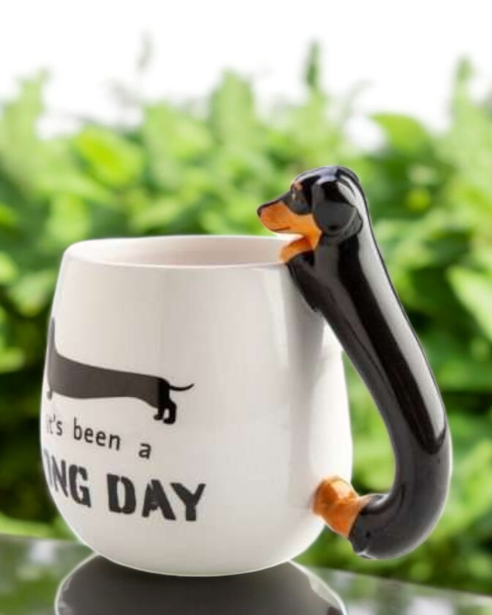 - Cute mug featuring a 3D handle shaped like a black & tan dachshund!
