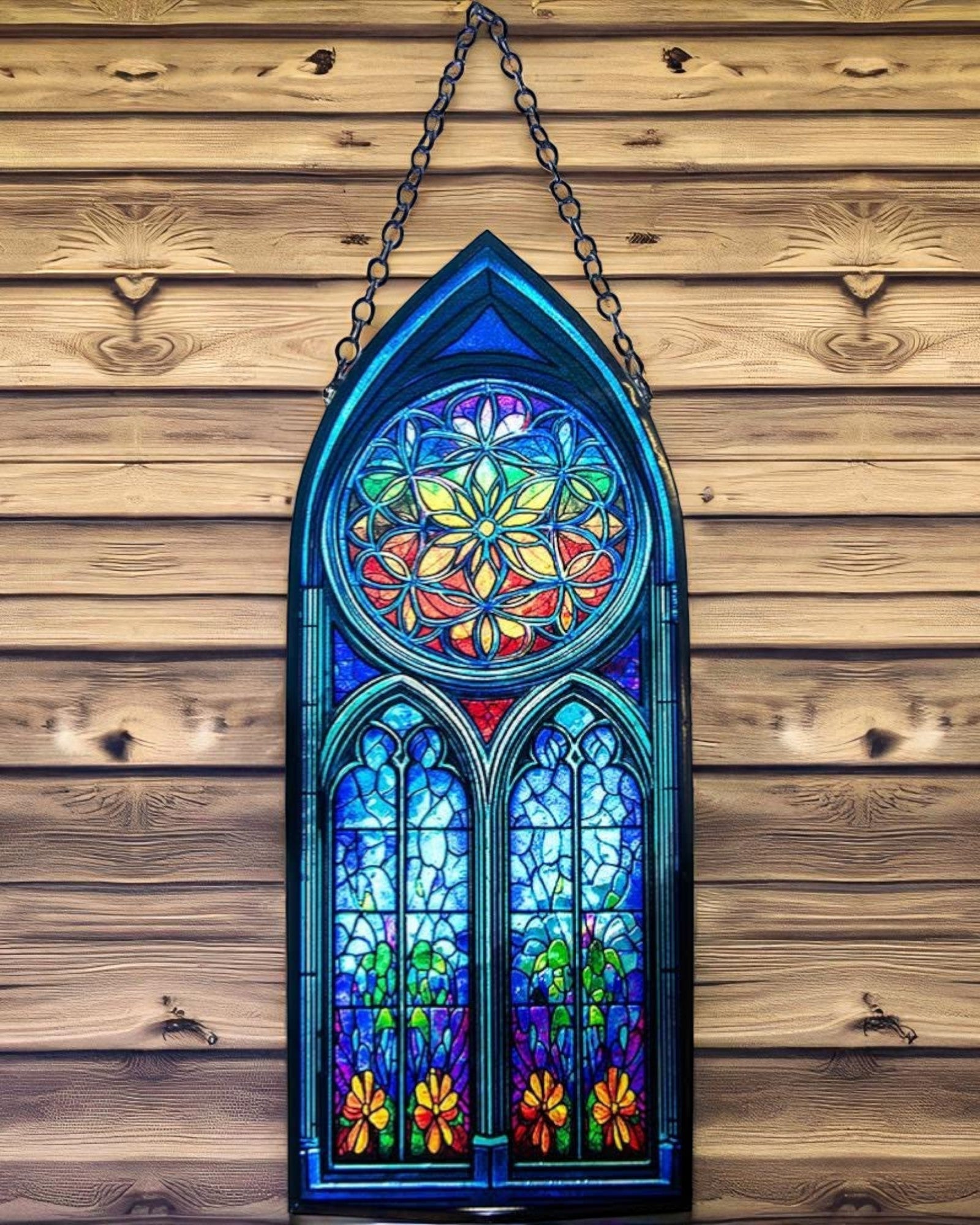 This stunning glass suncatcher features the sacred Flower of Life symbol in its upper section, representing unity, creation, and the interconnectedness of all things. The two lower windows add balance and elegance to the design, making it a striking and meaningful piece for any space. Perfect for those drawn to spiritual symbolism and intricate artistry, it brings a sense of harmony and inspiration to your home.