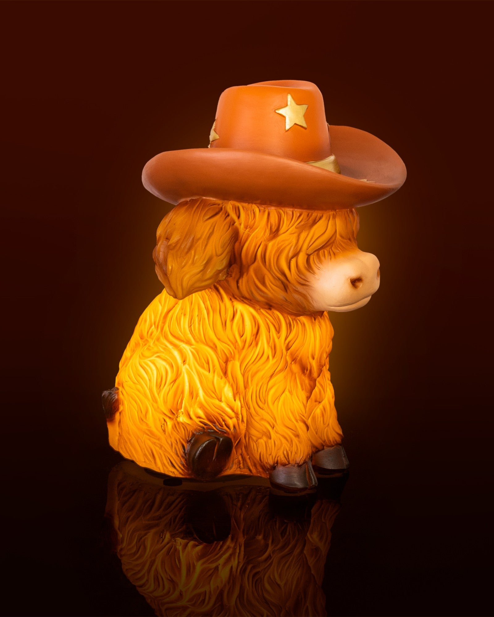 Giddy up for good vibes with the Highland Cow Table Lamp! This fuzzy little fellow is dressed to impress in a classic cowboy hat and ready to ride off into dreamland with your little buckaroos. Whether it’s lighting up a nursery, a cozy reading nook, or your wild west-themed den, this lamp wrangles up warmth, charm, and a whole lotta personality. Yeehaw and sweet dreams!