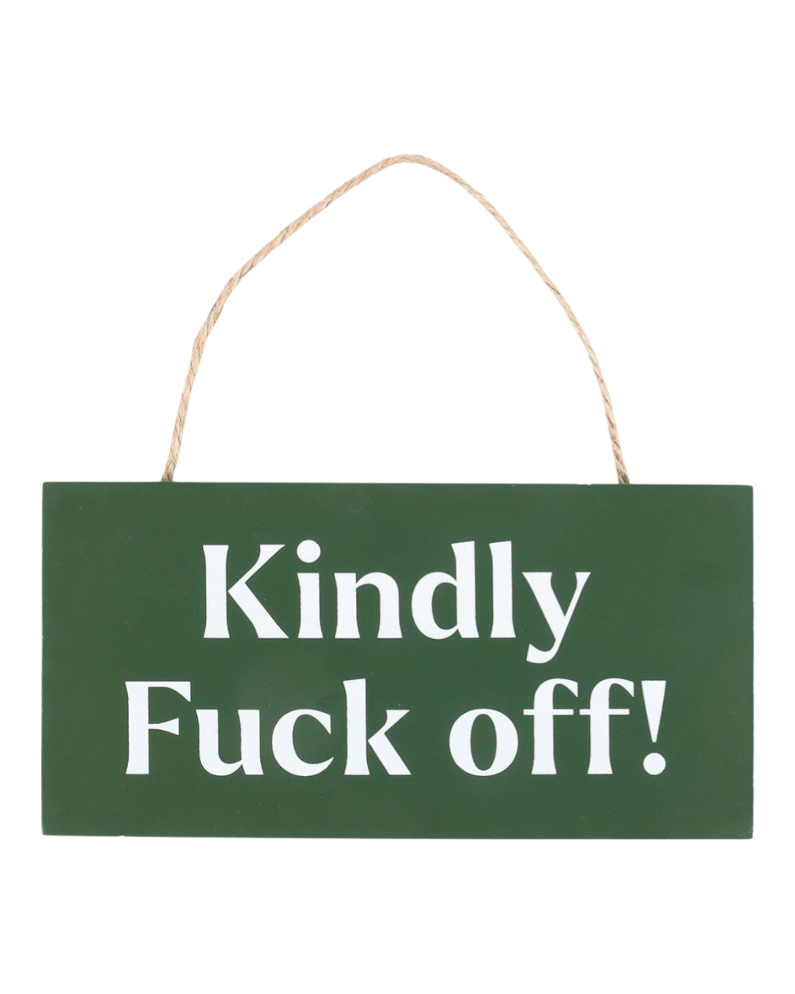 This hanging sign is a light-hearted and humorous way to express a common sentiment. With the playful text, "Kindly F*ck Off," it is sure to bring a smile to those with a unique and slightly offbeat sense of humour. Please note that this item is intended for adult audiences only, as it forms part of the Dark Humour collection, renowned for its bold and unapologetic approach to humour, often incorporating rude and sweary elements.