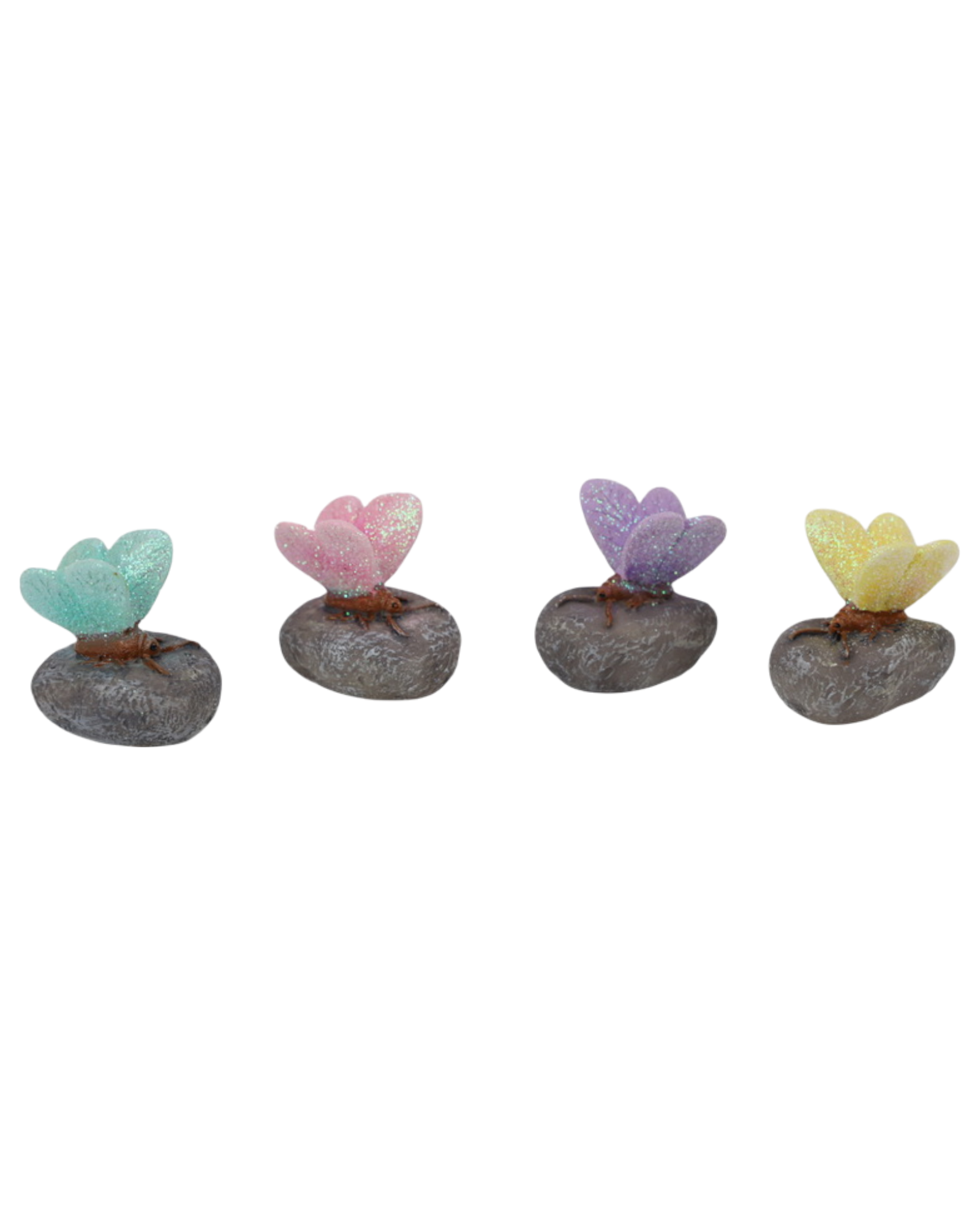 Set of four delightful 4cm butterfly figurines, each perched on its own charming rock base. Perfect for adding a whimsical touch to garden displays, terrariums, or indoor shelves. These tiny winged companions bring nature-inspired charm and a dash of playful personality to any space.