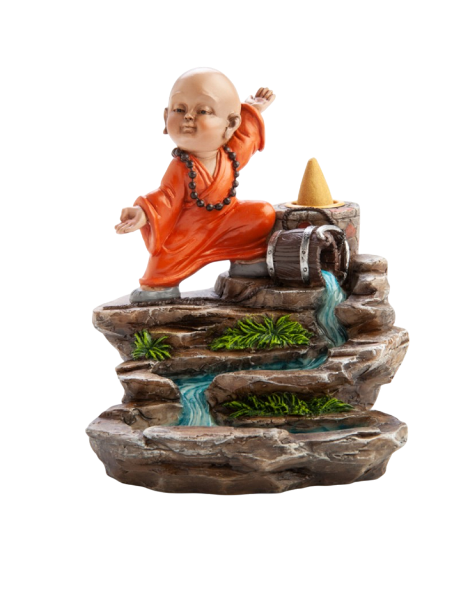 - Backflow burner shaped like a chubby monk practicising kung fu atop a rock formation