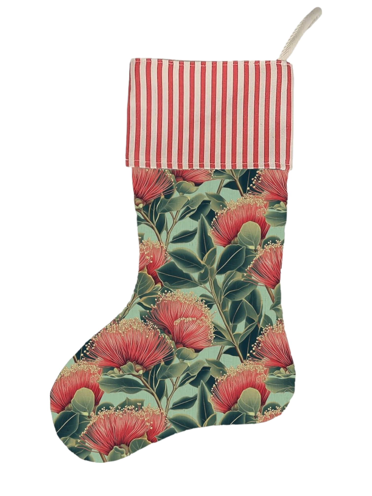 Celabrate true kiwi christmas with this delightful santa stocking featuring a vibrant pohutukawa design.