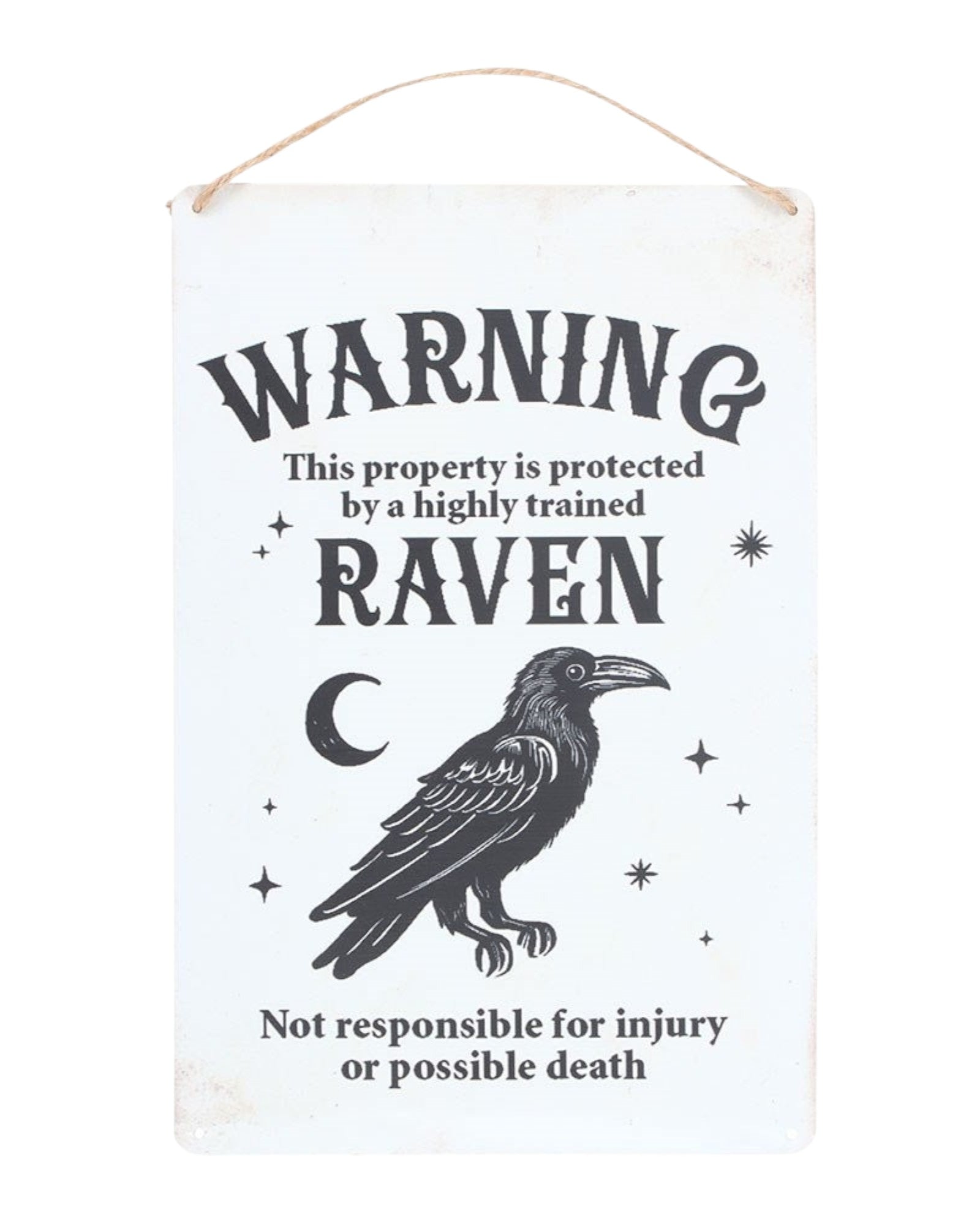 Warn your guests with this metal hanging sign declaring Protected by a Raven, complete with gothic raven and moon imagery.