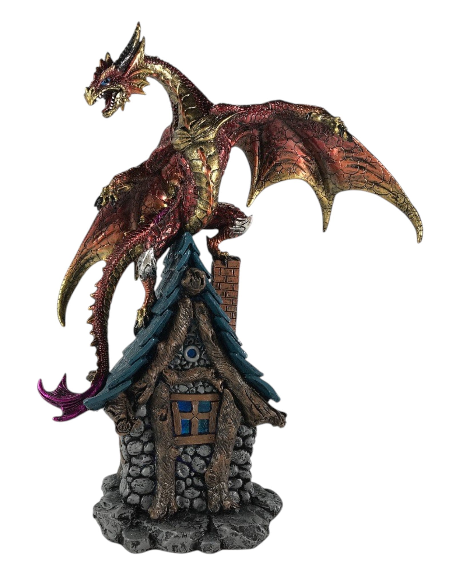 This ruby-red dragon struggles to find its feet on a small cottage as it prepares to let out its first fearsome roar to make itself known to all other creatures nearby.