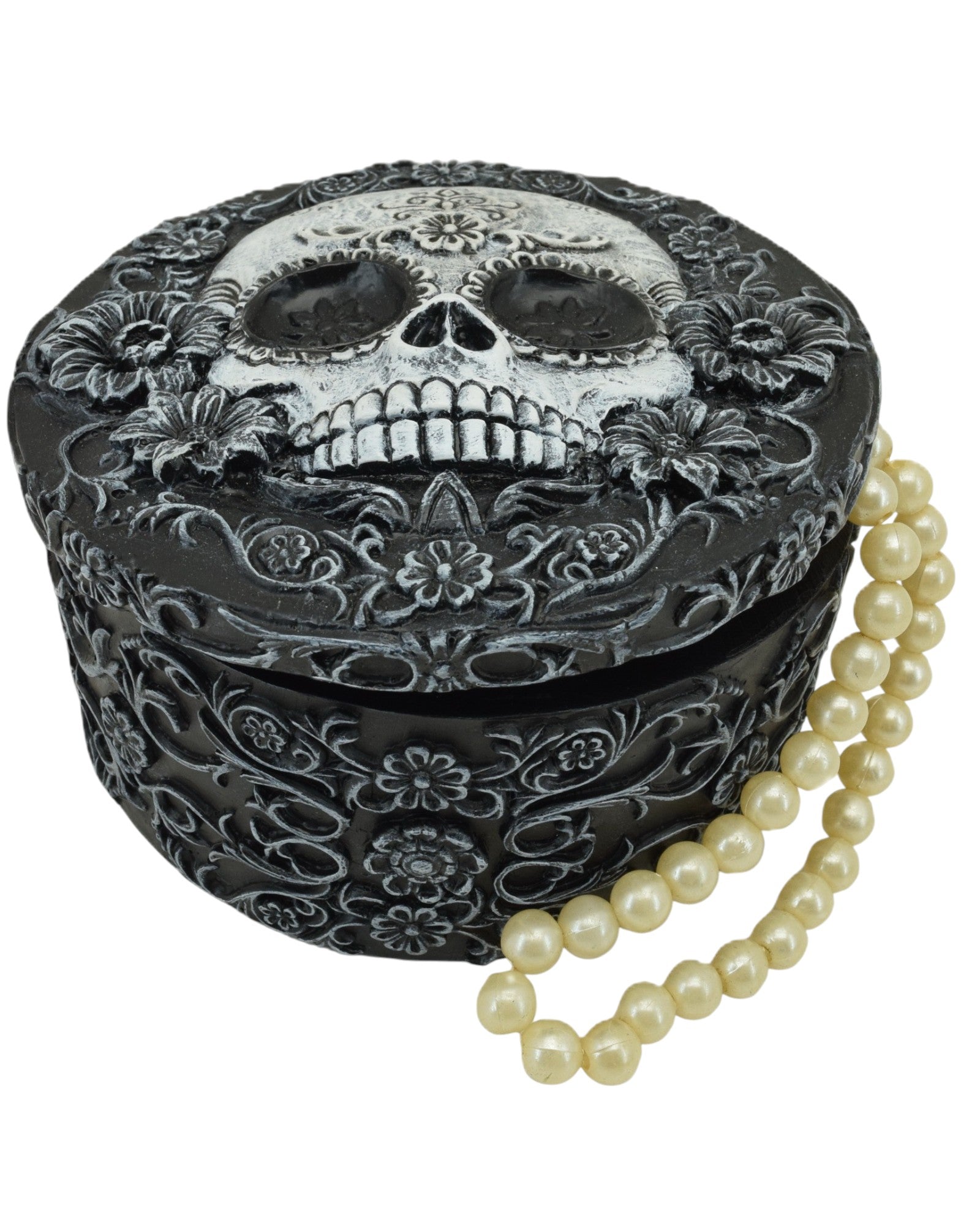 Make a bold statement with the Skulls n Flowers Trinket Box, measuring 11.5 x 11.5 x 6.8cm—a perfect edgy addition to your Halloween collection.