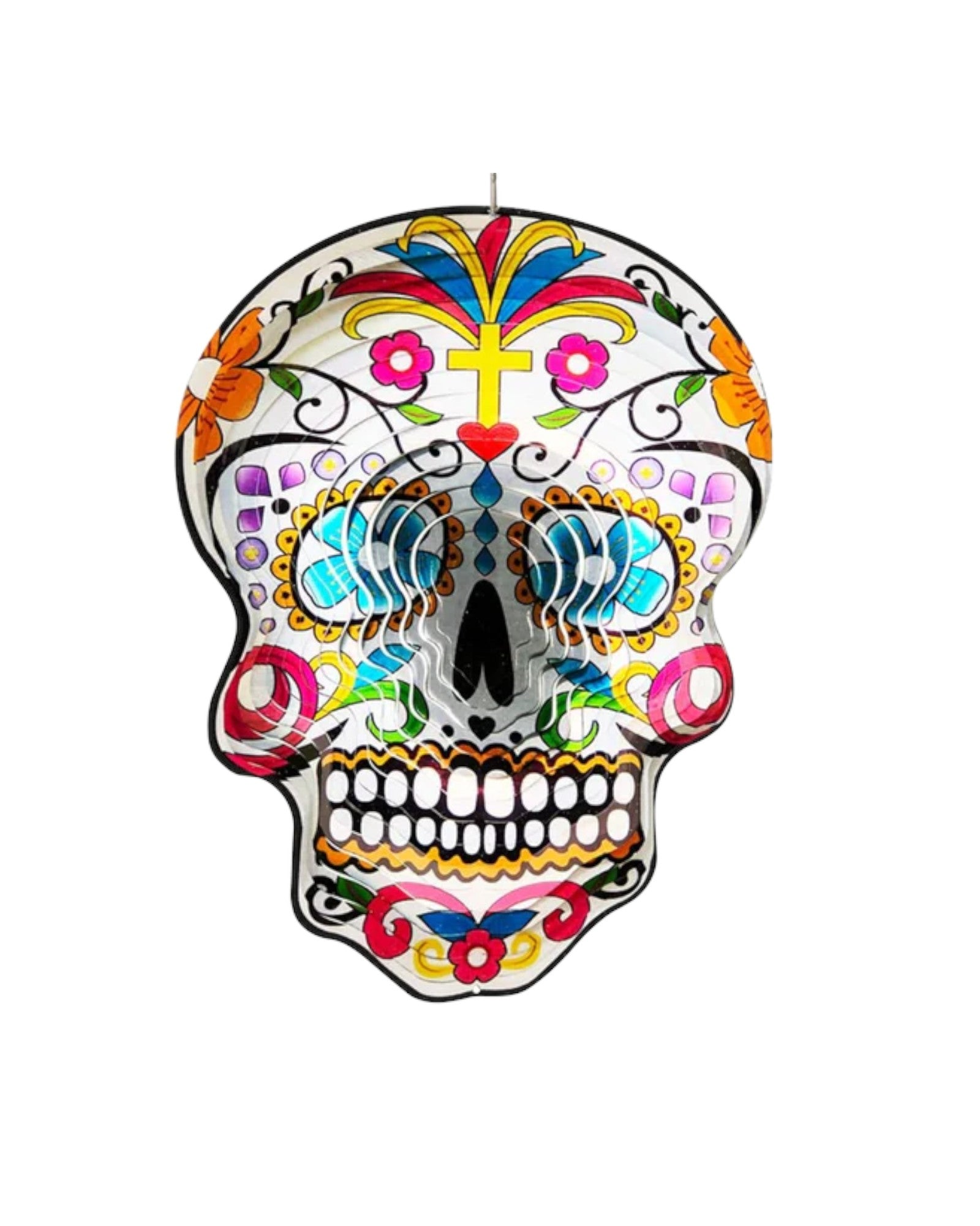 These wind spinners twist in a gentle breeze or a strong gust, creating hypnotic patterns and reflections of light. Watch in awe as the hypnotic patterns twirl and dance in the wind while reflecting light. This beautifully painted Sugar Skull is sure to catch your attention. Hang from a tree, patio or gutter and bring your garden to life!