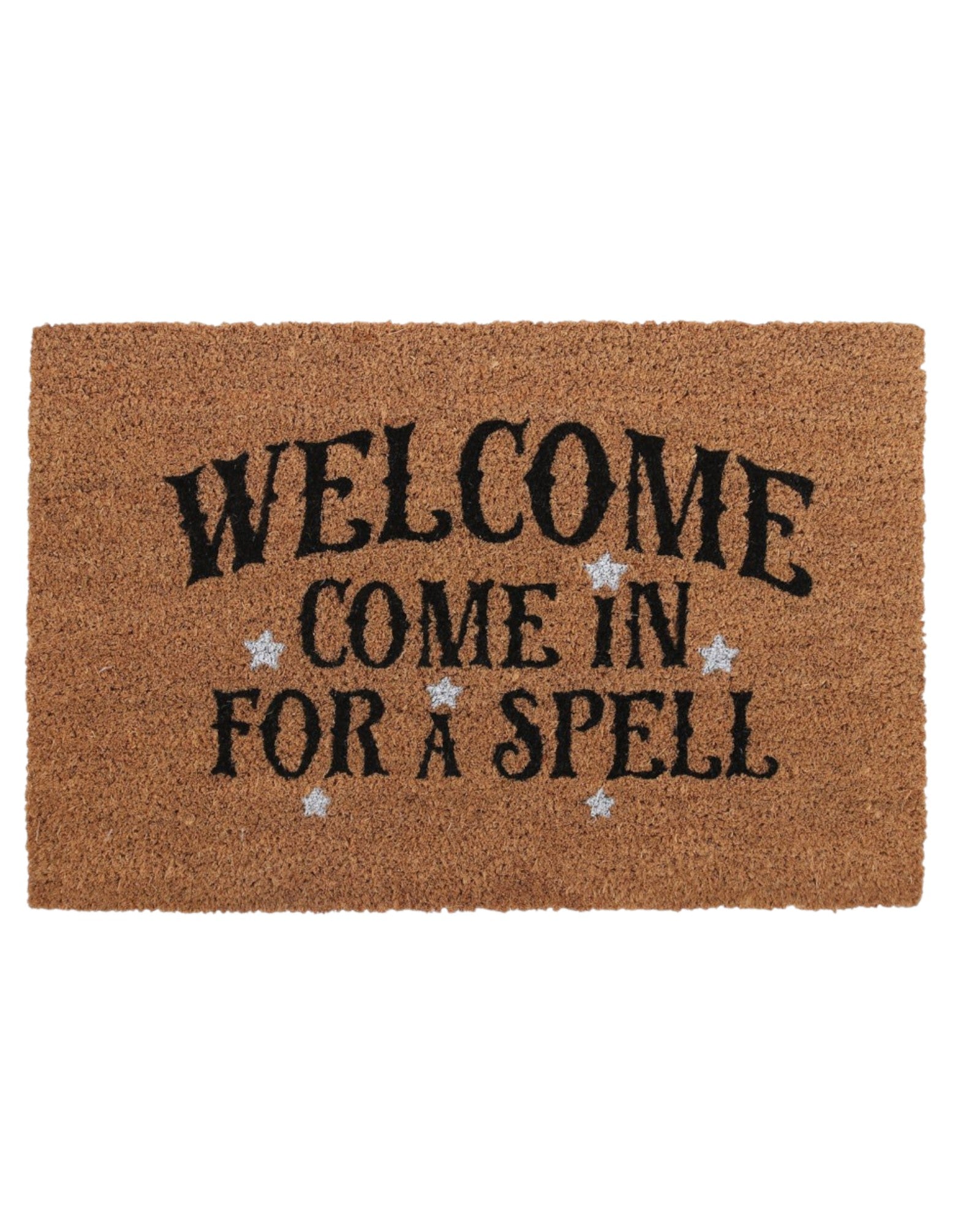 A natural coir doormat with printed 'Welcome Come in for a Spell' text and white stars.